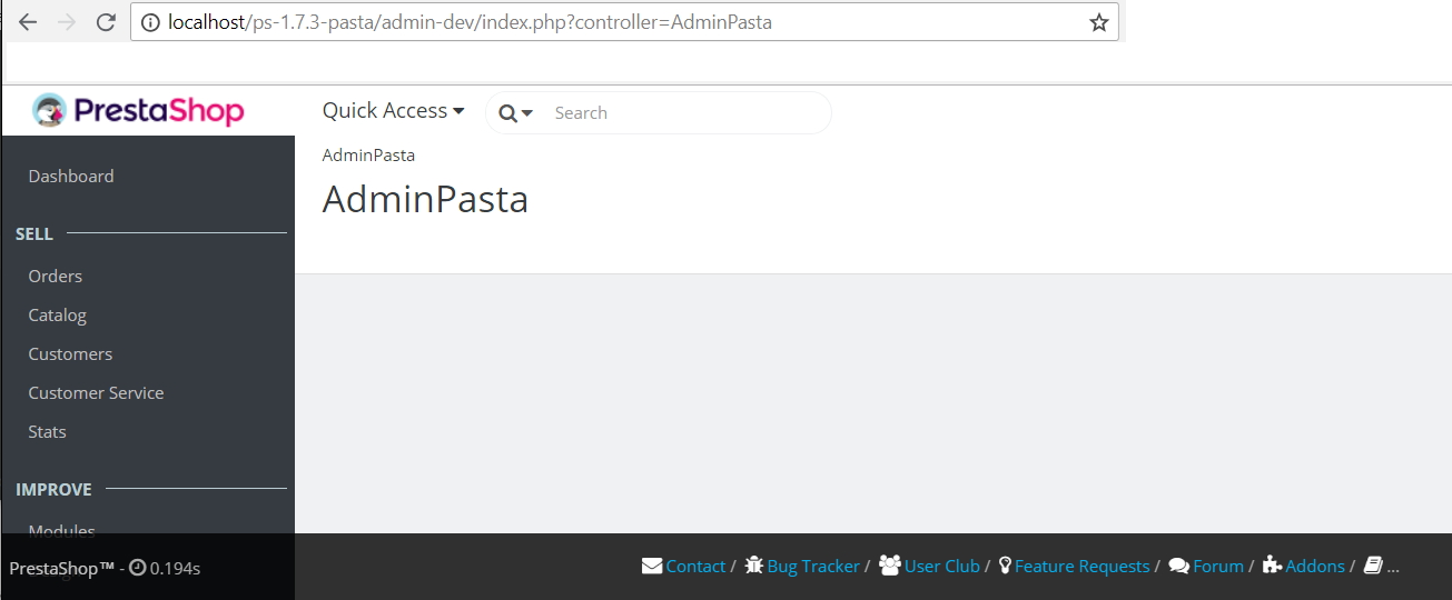 Head to http://localhost/admin-dev/index.php?controller=AdminPasta and you should now have an empty AdminController: