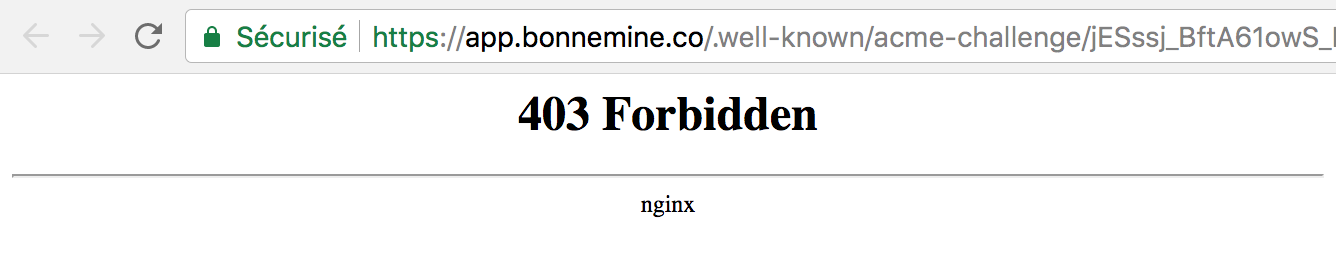 Let’s Encrypt uses a GET request to your website to automatically renew your certificate. Let’s Encrypt may encounter some 403 unauthorized when trying to make this HTTP request because it is trying to connect to http://your-site.com/.well-known/acme-challenge/a-long-hash-here. How to authorize Let’s Encrypt to connect? Let’s find out if you got nginx set up as a reverse proxy!