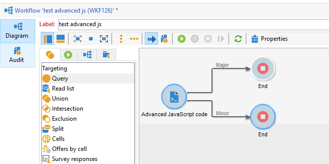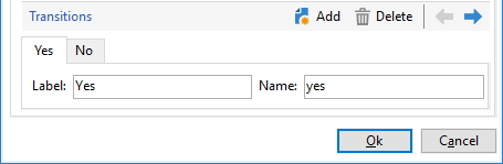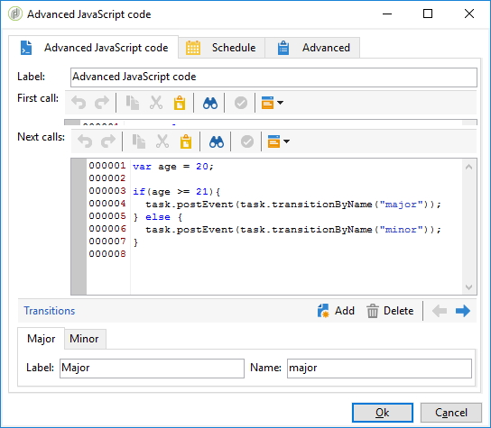 With the defaultJavascript Code we only have 1 transition named ok. But what if you want to use multiple transitions, depending on conditions? You have to use an Advanced Javascript Code and call task.postEvent(task.transitionByName('transition'));