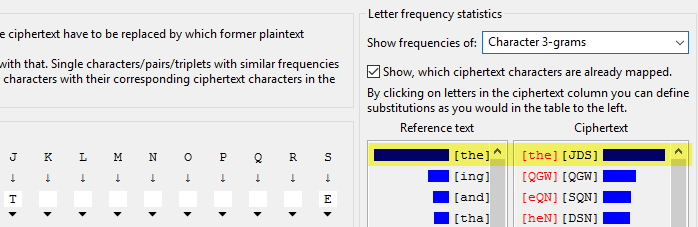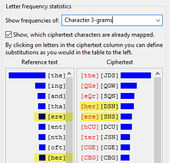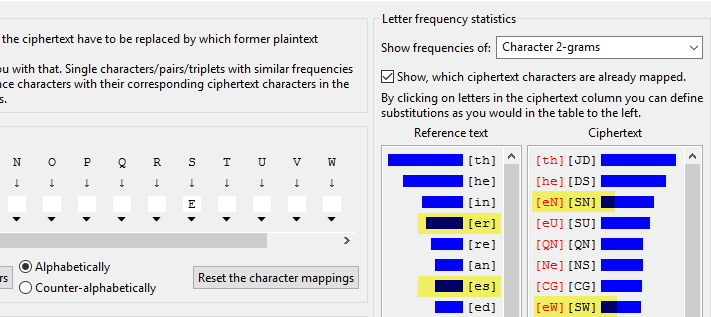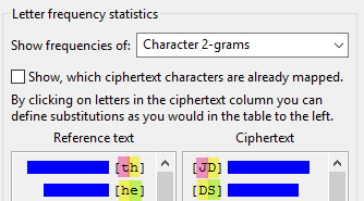 As we saw previously, we cannot rely on 1 letter analysis, so let’s try Bigrams. Open up the Character 2-grams analysis. The top 2 most frequent bigrams in English are [th] and [he]. In our texts, it’s [JD] and [DS]. Noticed the D?