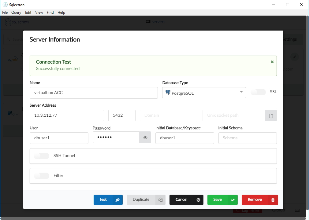 You can check your PostreSQL setup by connecting to your Guest via SqlEctron (or any SQL client). To do so, some extra steps need to be taken, see Allow external PostgreSQL access at the end of this article.
