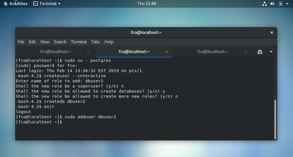 [fco@localhost ~]$ sudo adduser dbuser1 # create a Linux user with the same name