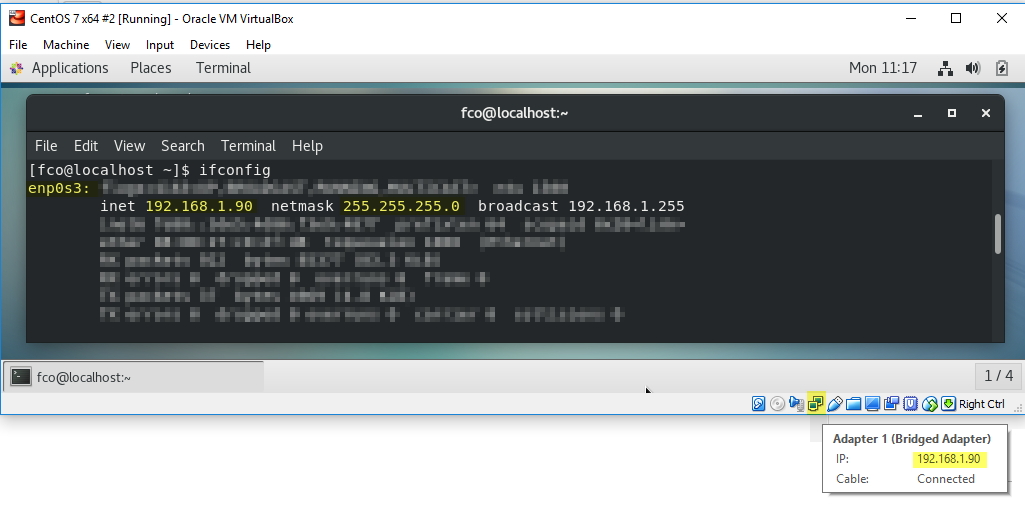 on - VM: Applications > System tools > Terminal > $ ifconfig