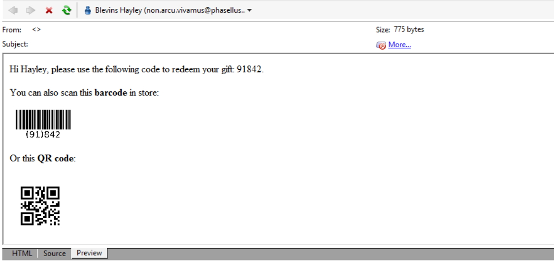 The goal here is to send a custom email per recipient. Each customer will receive an email with its own code. It can be displayed in plain text, as a EAN-128 barcode or as a QR code: