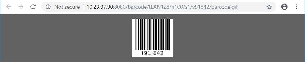 height/sscale/vcouponCode/barcode.gif - Example: http://10.23.87.90:8080/barcode/tEAN128/h100/s1/v91842/barcode.gif