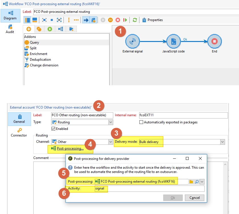 signal, linked to JavaScript activity (use the same code as previous chapter), linked to an End activity. - Duplicate your delivery’s current routing (Administration > Platform > External Accounts (nms:ExtAccount)) and then from the delivery Properties > General > Routing