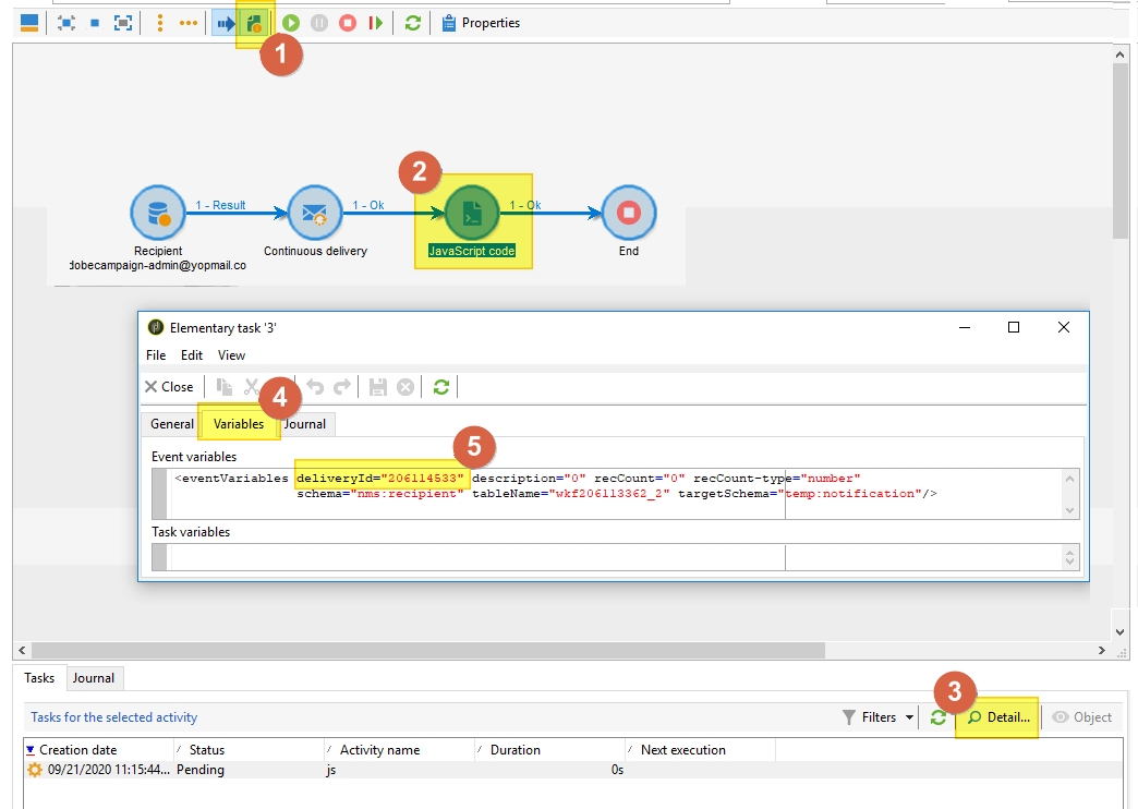 Start the workflow, launch your campaign/delivery and debug the workflow, like before. you’ll have the following variables in the eventVariables XML doc: